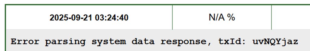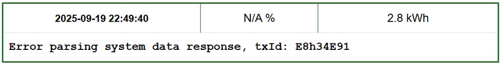 {"data":{"time":null,"status":"Unknown","solar":{"power":null,"arrays":[{"array":1,"voltage":null,"current":null,"power":null},{"array":2,"voltage":null,"current":null,"power":null}]},"grid":{"voltage":null,"current":null,"power":null,"frequency":null},"battery":{"percent":null,"power":null,"temperature":null},"inverter":{"temperature":null,"power":null,"output_voltage":null,"output_frequency":null,"eps_power":null},"consumption":null}}