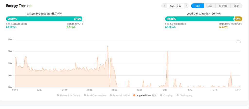 Since the last software update, the statistics are incorrect, and nobody has reacted so far. When you look at the graph, you can see that from midnight until 6:00, the system used at least 12 kW from the grid, and later on also more than 6 kW. However, in the displayed statistics, there is no grid import shown between midnight and 6:00.