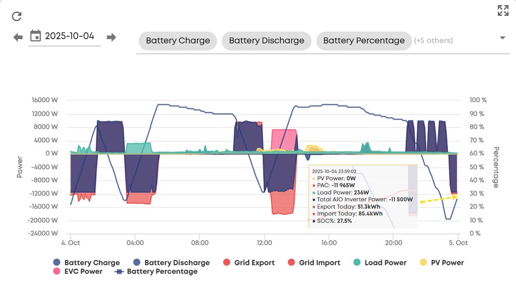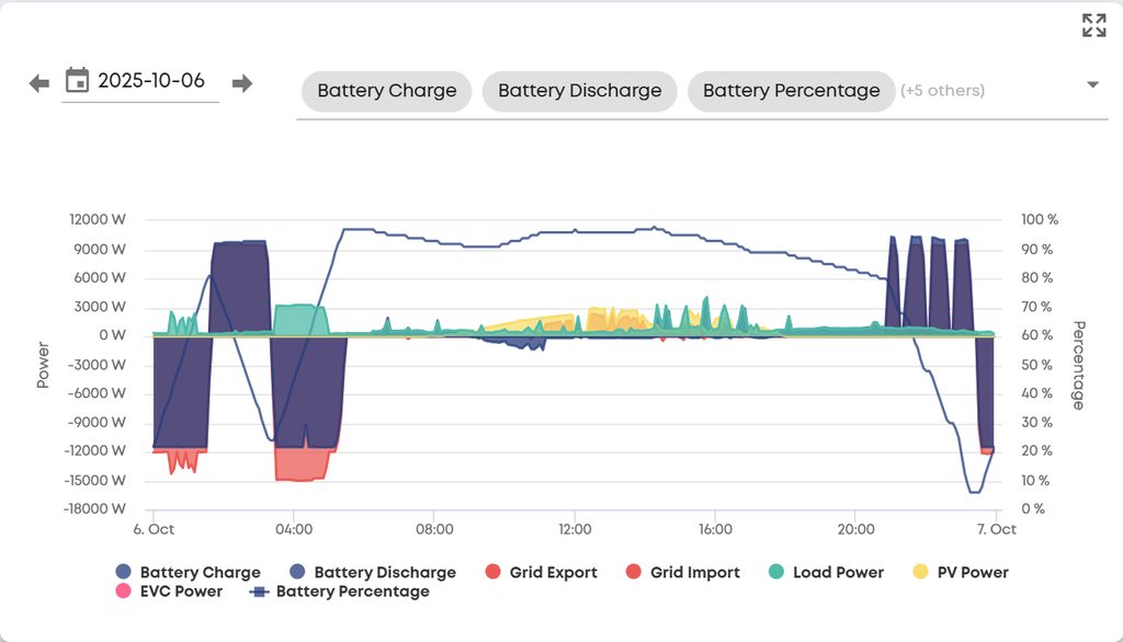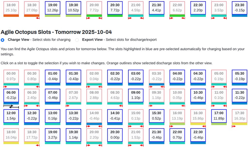 At around 4.30pm each day (so not set and forget) I look at the next days slot pricing on WonderWatt and, if it's a plunge day with many slots below 13p, I select charge and discharge slots to maximise my exports whilst minimising the import slot costs. I receive 16.5p per kWh from Eon Next for export so, factoring in around 20% losses through the battery, slots below 13p are worth importing then exporting.