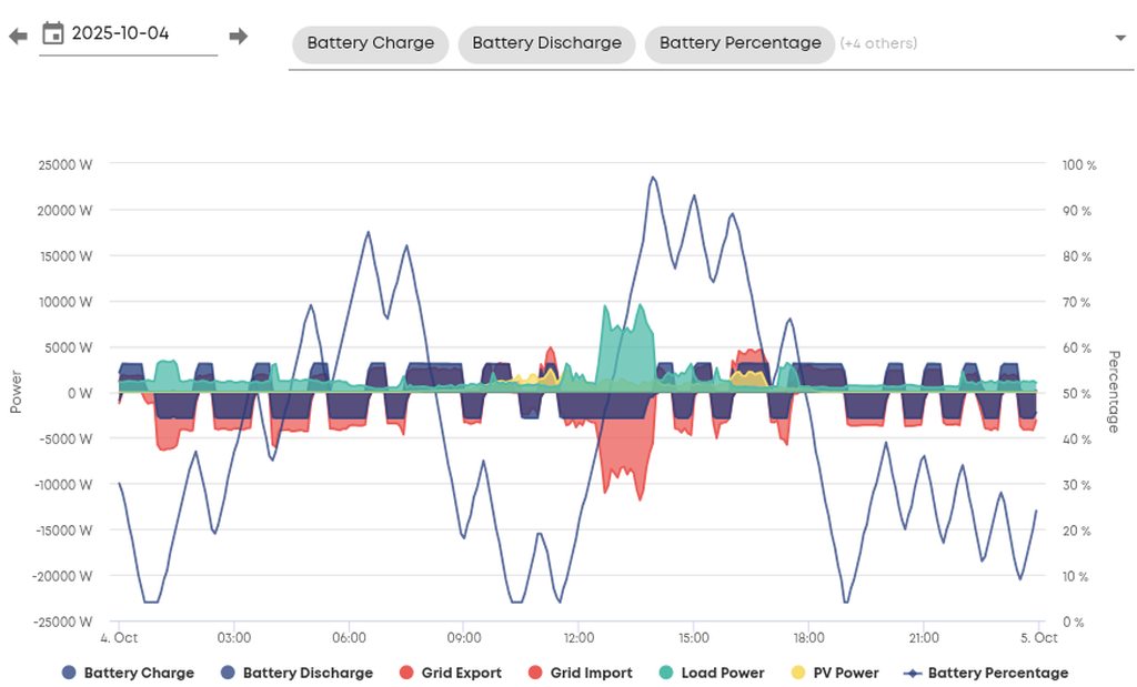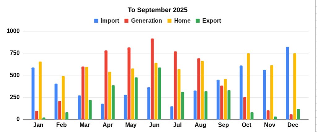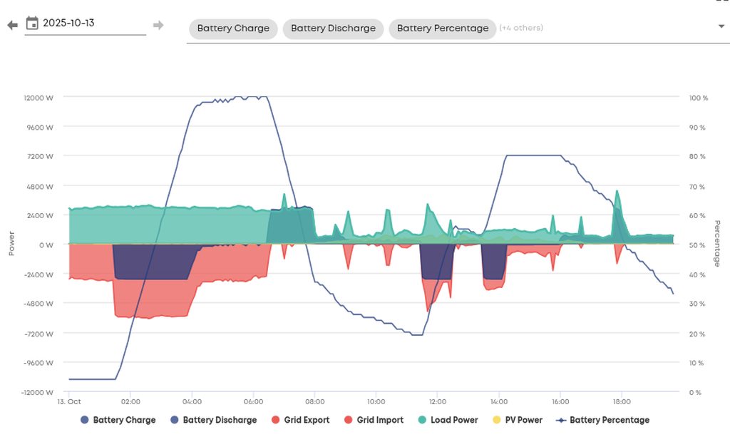 Notice the massive house load between 12.30 and 2pm. This was the free Octopus session where I managed to import 14kWh by turning on the aircons to heat, heat the water, clean the oven, run the dishwasher and washing machine and charge the batteries.