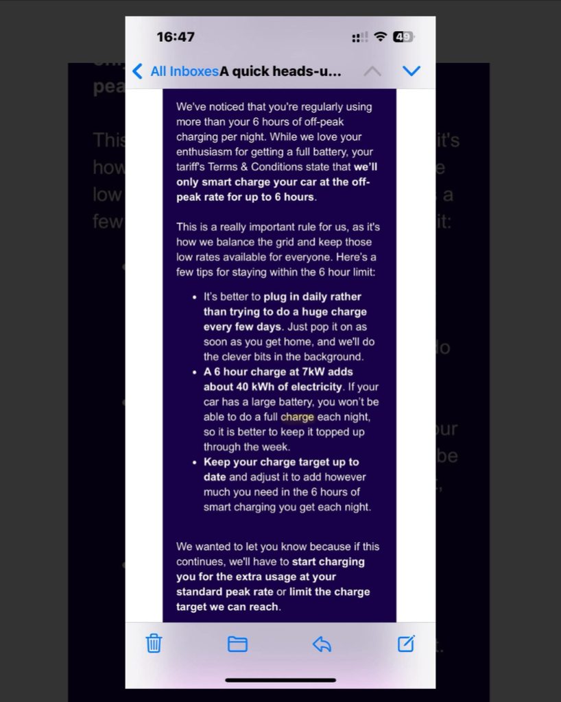 johalareewi Easily. You plug your car in, ask for a % SOC that is completely beyond the scope of your charger to achieve in the time window and Octopus goes for it, trying to meet the ask. I have repeatedly requested a date selector on the Time selector in the Charging Preferences window. But they have yet to offer that option, so you either need to 'manage' what SOC each 24-hour period brings, or Octopus will try to meet the demand on your selection.