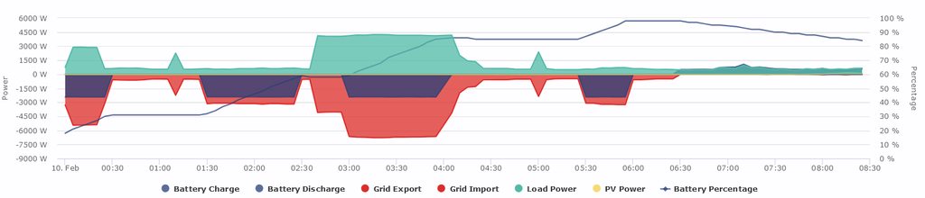 Next charge at 01:30 Charge is restored to 2600 but discharge remains at zero.