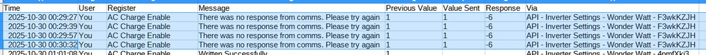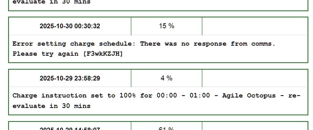 An error has occurred when trying to send a Agile charge instruction to your inverter, please check your Wonder Watt activity log. 00:30