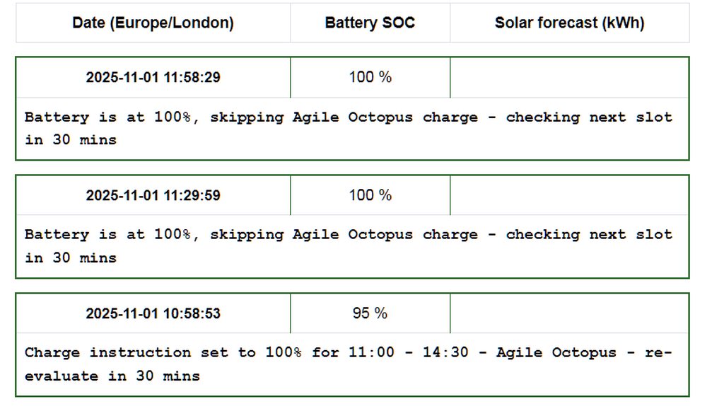 johalareewi I have Agile window that is active with SOC test = 101% I have manually selected charge slots but WW is skipping them because battery SOC is 100%. neighboring-volume