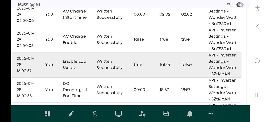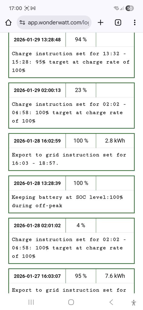 Hi WW, I noticed an error on my system on the 29/01/26. I've been using WW since 14/01/26 and it has worked reliably except on this day but worked normally again today. What happened was that on the 28/01/26 at 16:02 my Evening discharge started normally after disabling ECO mode but at 18:57 there were no log entries to stop the discharge from WW and turn ECO mode back on. The discharge window was set 16:03-18:57 and WW did not adjust the end time. I only noticed on the 29th when the battery SOC remained at 94% instead of supporting the house load.