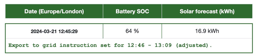 One of the big things addressed here is the earlier cut-off in terms of end time for the export, based on a calculation of current SOC, stop SOC and the max discharge rate. Shortly before (minute or two) this new end time is due, we reset back to Eco (for Giv) and 'disable' the schedule.