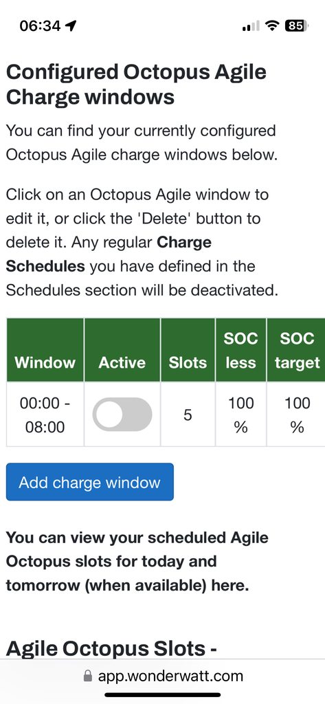 I kept the afternoon slots as I wanted to charge my EV. At 13.30 the EV starts to charge, the slots in WW are highlighted, the battery is discharging to the car but is not charging. Checking the GE app, no timed programme for charging. Eventually via the GE app I started battery charging manually.