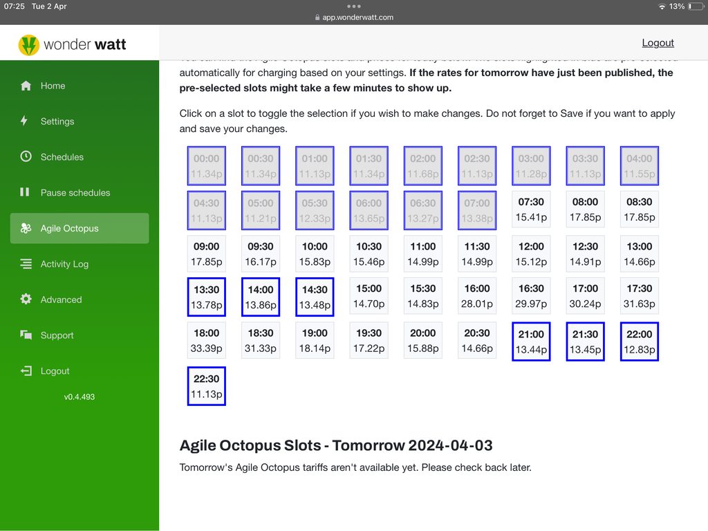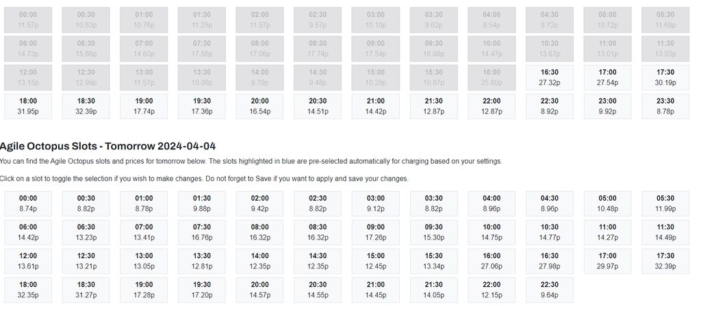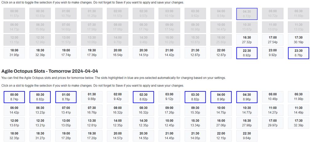 Equally, the prepopulation runs at 22:15 and 23:15 too, and will populate active Agile charge windows where no slots have been selected yet.