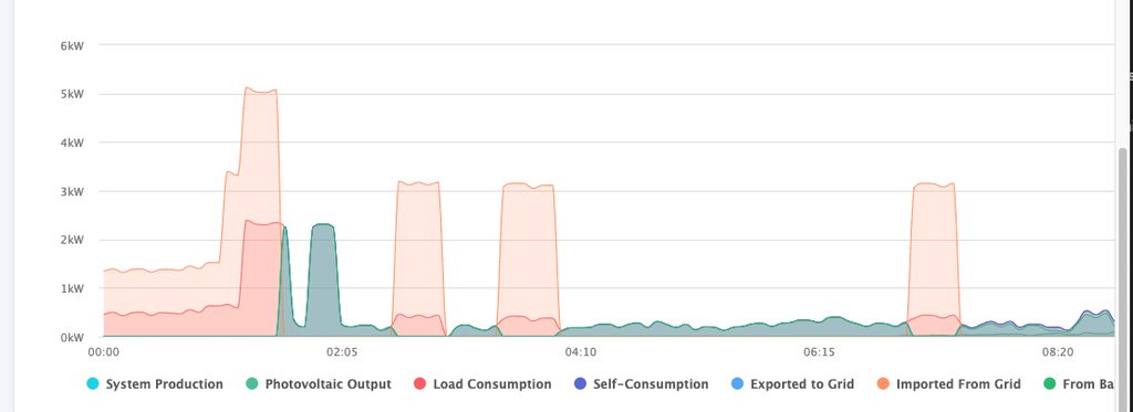 The problem is that in between those half hour blocks, the battery was discharged to power the house. This is not only in contradiction to the proper mapped charge but was unnecessary anyway as IOG always has off-peak rates between 23:30 and 05:30 - in fact of course the battery should still have been charging from the grid due to the dismal forecast.