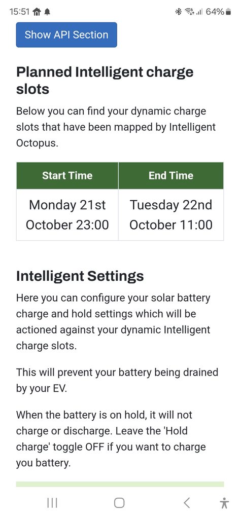 Here's one of mine, where the smart charge started at 23:00 (even though the EV didn't actually start charging until 23:29), but you can see it cut short the discharge, which was timed to finish at 23:25