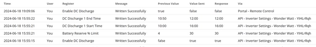 Today it's errored again - it failed to stop exporting at 7pm as set in the schedule. The WW schedule says export from 4pm-7pm. However, according to the inverter logs, the instruction WW sent to the inverter was export from 4pm-midday!