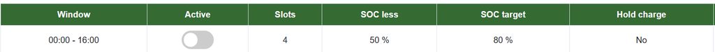 This is my normally active charge setting [disabled today due to many hours of low price leccy today and hold charge does not work for me - it just pulls from my AIO throughout the entire period]