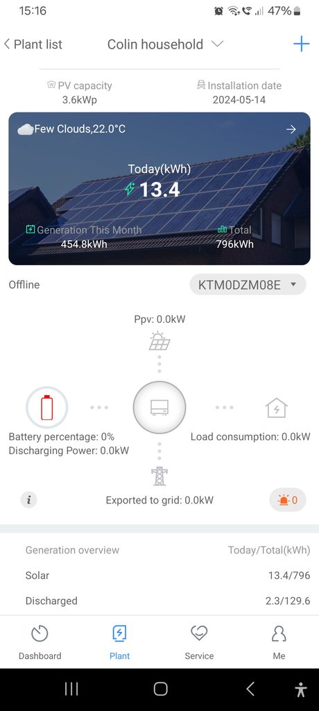 During a fault episode, the graphical representation on the both the Dashboard and Plant screens shows no data. If you compare the attached screen shots (one normal, one faulty) you will see what I mean, with the inverter shown as being offline (which it isn't) in the faulty case. The inverter is connected solidly to the Ethernet via a ShineLan adaptor.