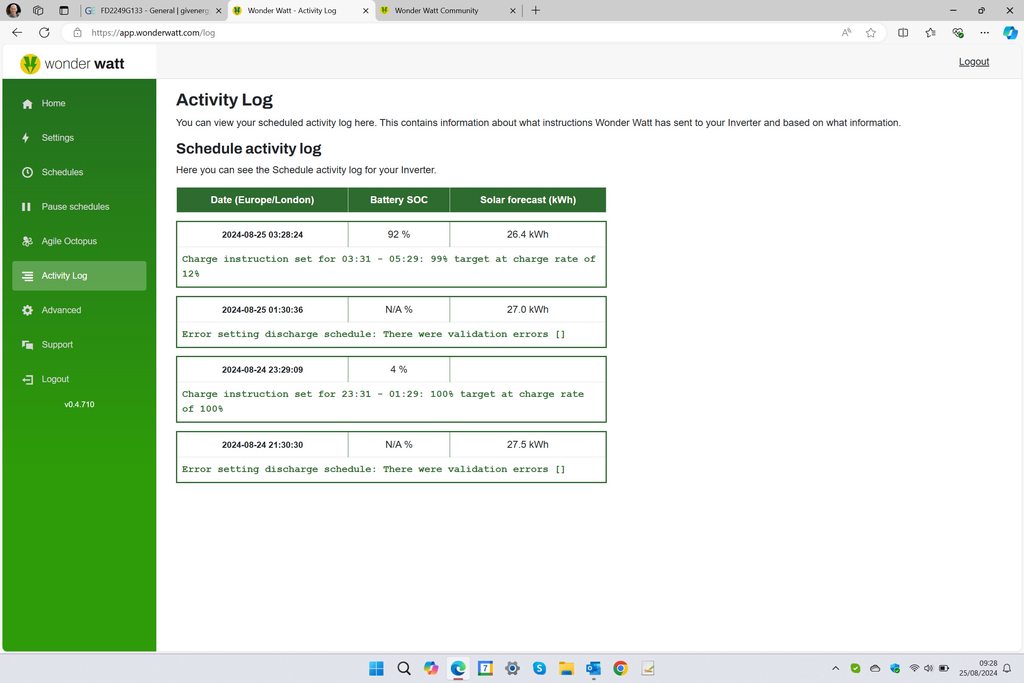 New to Wonder Watt. Tried sequential charge and discharge cycles overnight last night. Charge x2 worked, discharge x2 ('export') did not. Log shows validation errors. What have I done wrong please?