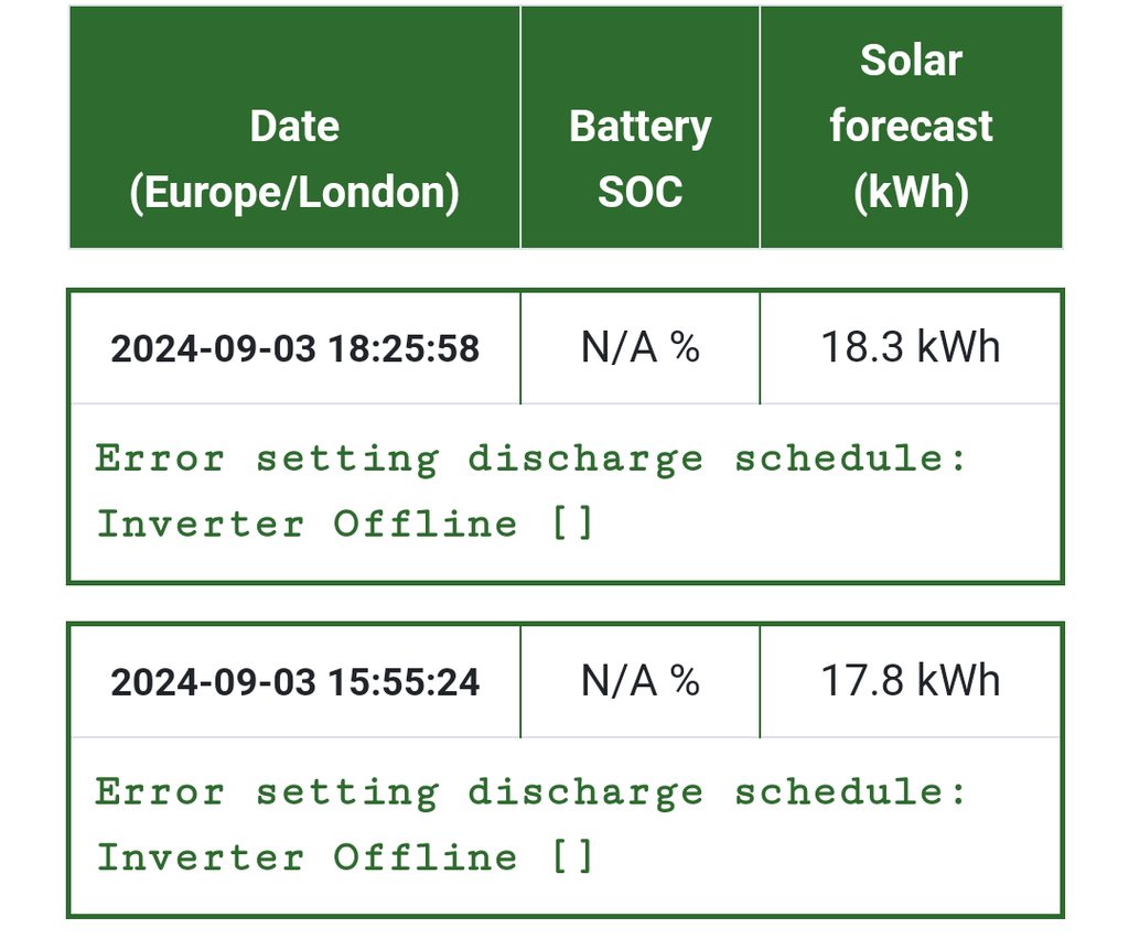 I realised that my timed export scheduled for 16:00 today had not happened, and on checking the logs saw it reported that my inverter was offline.
