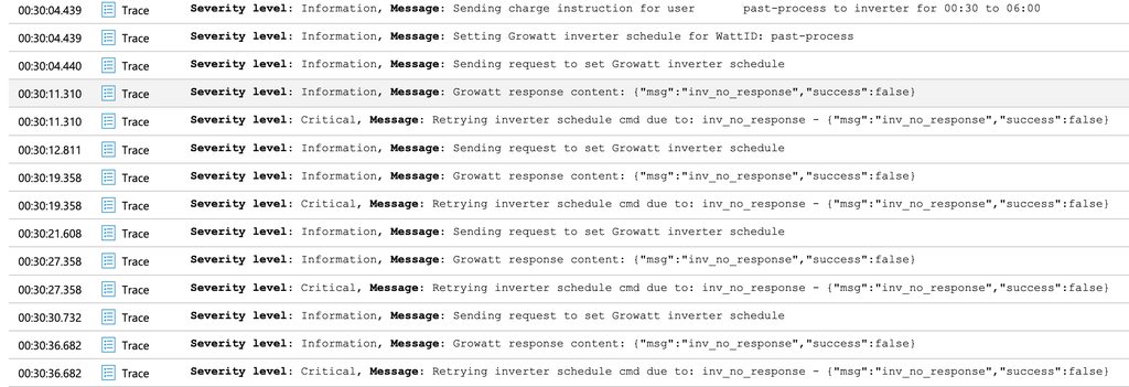 admin 58southamptonroad Looks like we sent the instruction correctly, see the diagnostics logs below, but got an error response back from Growatt. Do you sometimes have connectivity issues with setting charge instructions?