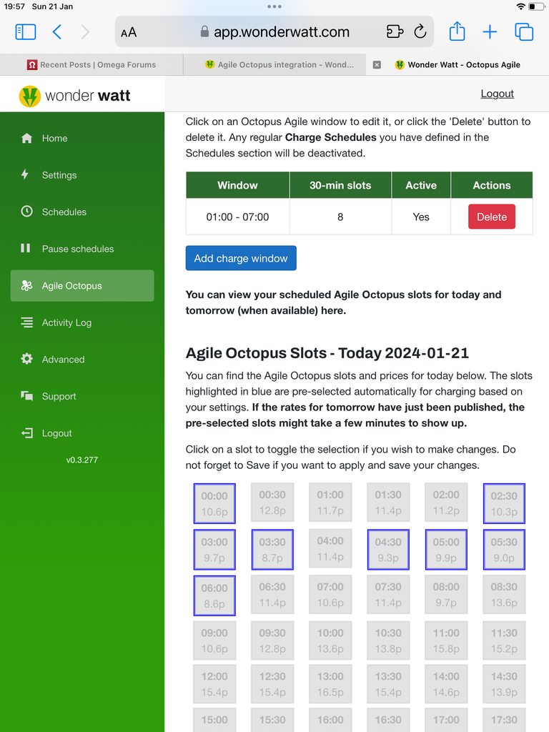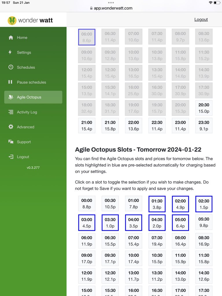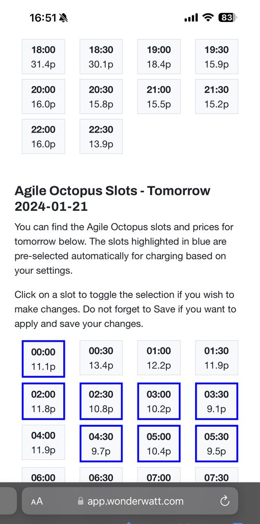 However, I have a heat pump that can use 2kWh - 3kWh when it's very cold, so one battery may only last about 4 hours then I'm on day rate electric. Day rate for Octopus Go is 29p. On Agile it varies. I try to charge the battery as much as possible on the cheaper periods throughout the day so that my average user price is as low as possible, yesterday for instance it was 13.5p/kWh.