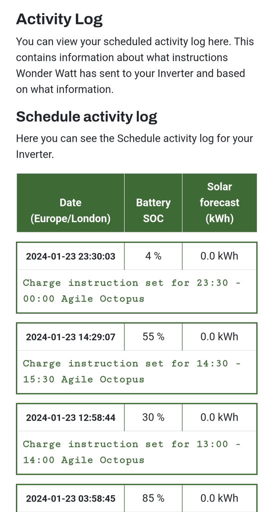 I just need to get my head around using Wonder Watt in coordination with manually setting up my EV charger (and occasionally my solar-diverter / water-heater on price-plunge nights) to best use the 1/2hr slots. Any plans to integrate EV chargers as well as inverters into this system??