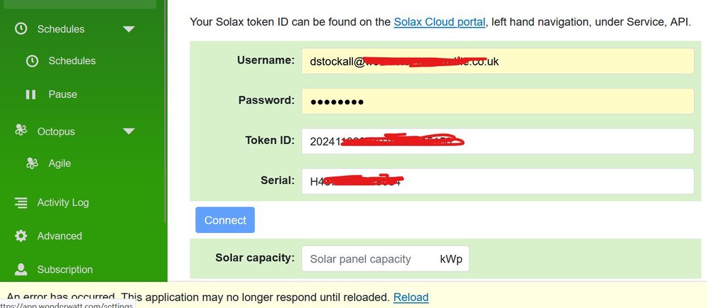 admin PeterChurch Could you drop us a line please Peter? labs@wonderwatt.com - we'd like to get this sorted. We checked the logs and can see your token is invalid: Could you try generating a new Solax token please?