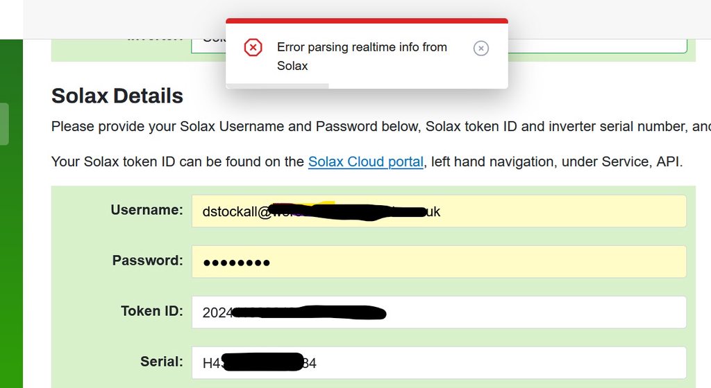 admin Pablo We've just added some additional logging and capturing of the error response from Solax, could you please attempt to connect again? It will fail, but we can inspect the response and work out what has gone wrong. Thanks!