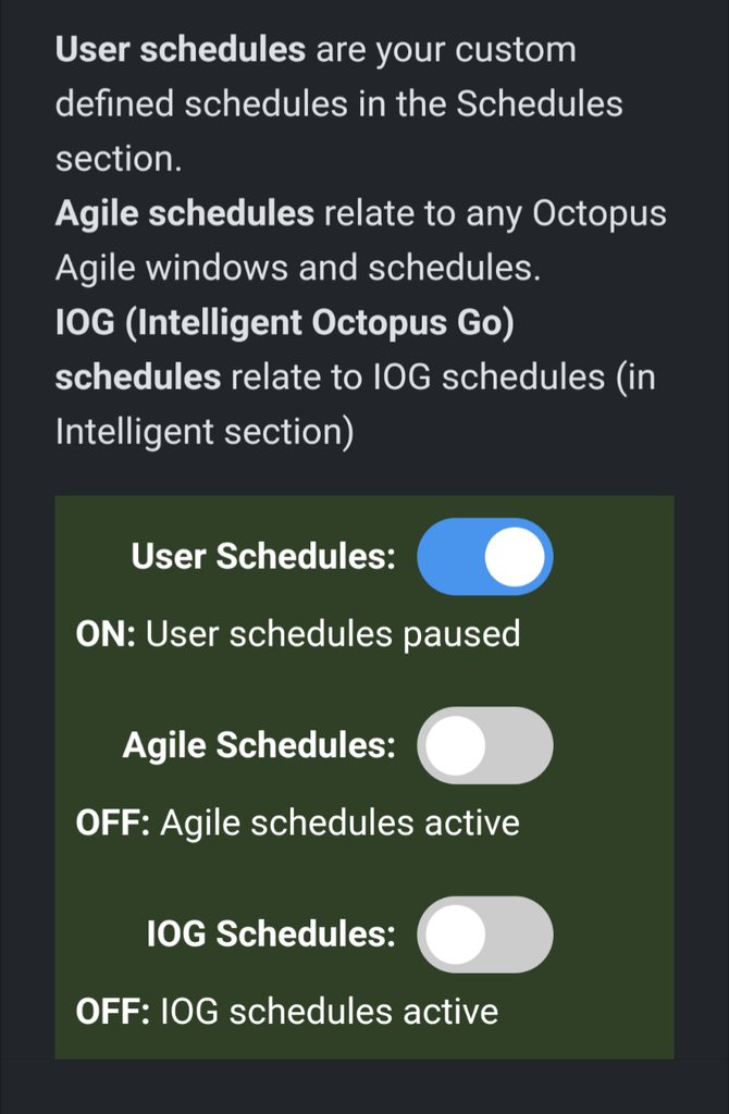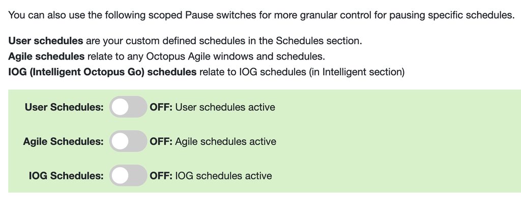 J1m We'll have a think, I guess we could have a separate Pause IOG Schedules, Pause Agile Schedules, Pause custom Schedules toggle in addition to the Pause All Schedules option.