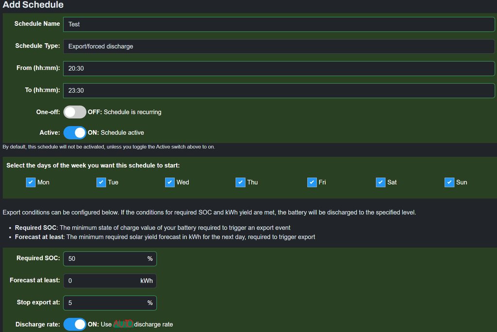 eg export 5kw or 6 over 2-3 hours at auto adjusted rate, or fully drain to midnight until next offpeak rate starts