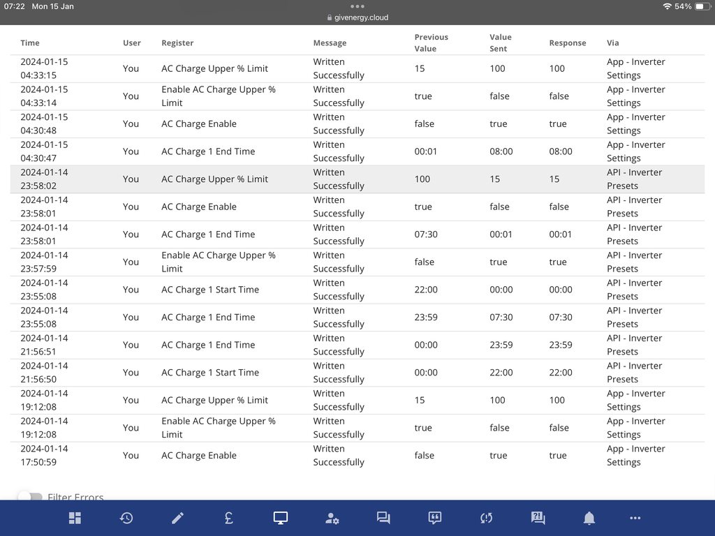 The settings had changed from charge from grid and solar to just solar and the max charge to 15%