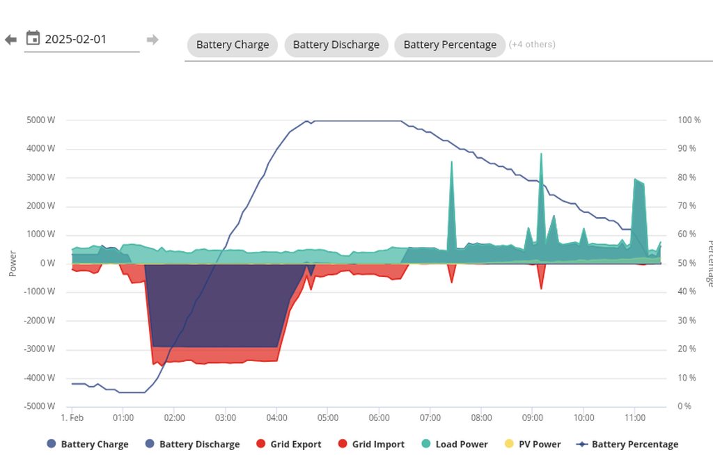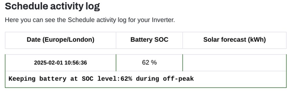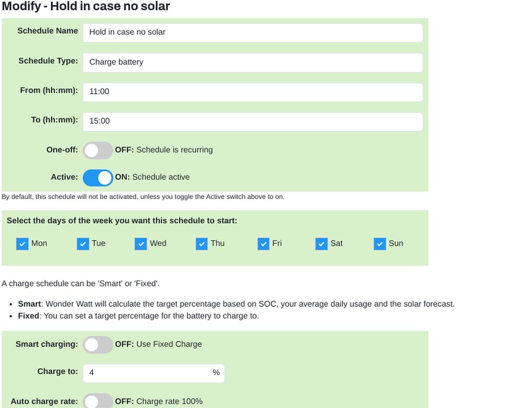 I noticed the smart charge option has a "Don't use battery off-peak" mode which with my usage translates to WonderWatt not allowing my system to discharge the battery at all while during the scheduled time, if the battery already reached its max.