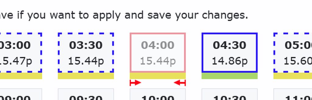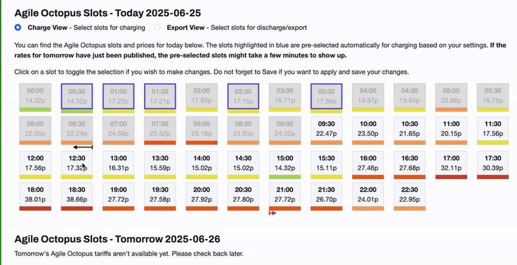 webmink This would be a good enhancement. I am doing this manually by pre-selecting all slots below 13p then deselecting the most expensive ones (even though below 13p) adding them as exports in the schedule. It takes me about 10 minutes to go through them then verify them (the red arrows showing the exports are really helpful). Starting with no charge (0) I count the slots to add up to 6 by the end (charge = +1, export = -1) and never more than 6 in the middle (7 is a full charge for my batteries). This means I import the maximum at the lowest cost. Finally I set my immersion heater on for the lowest 6 slots to heat my hot water too.