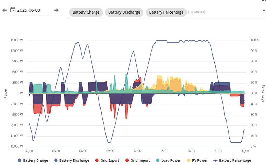 In the schedule below I harvested about £5 during the 24 hours (exported 31 kWh some of which was solar) for an import cost of 80p for 32 kWh. A net gain of £4.20 - not bad for 10 minutes work.