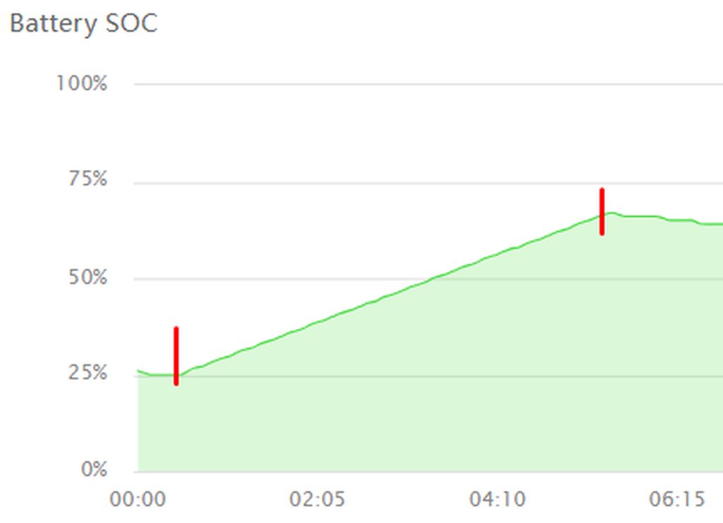 In a charge schedule I enabled the "Auto charge rate" option rather than set it to 100% as thought it would be kinder on my 13kWh Growatt battery stack. The target SoC target was 100% over a 5 hour charge period.