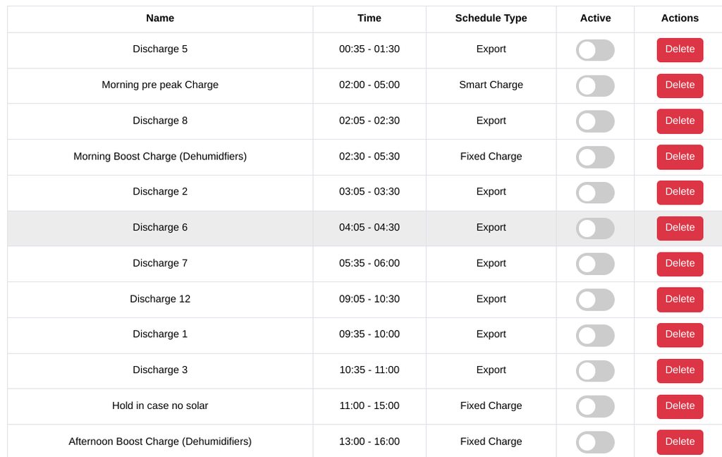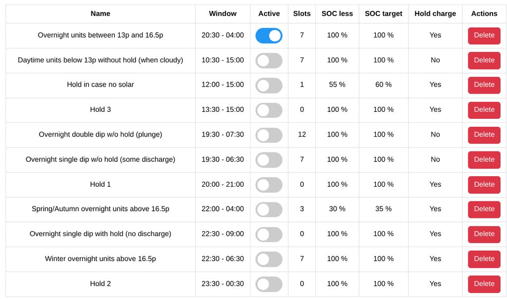 Pedro1972uk These are mine but I suspect they are fine-tuned to my setup. Each day I adjust the time slots depending on the slot prices and choose the schedule most appropriate to time of year and expected solar for the next day. Certainly you can start from these in finding your own that work well.