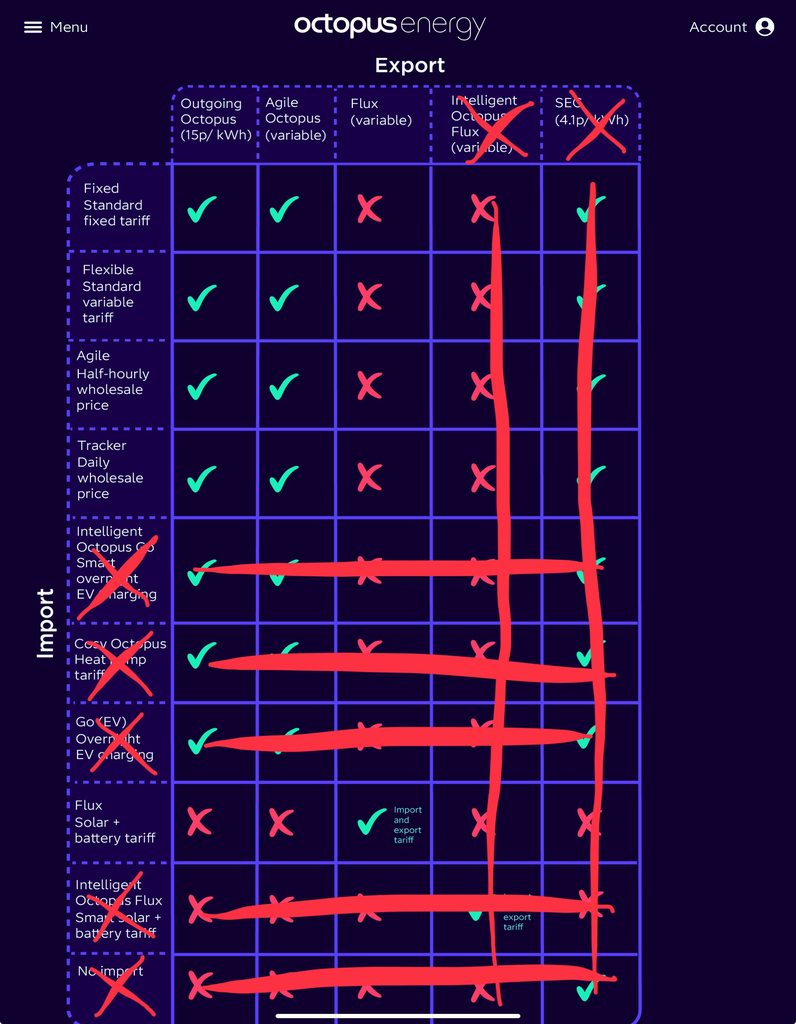Following some further research on their website this afternoon, it’s become a bit clearer and seems that for a standard solar/ battery install (with no heat pump or EV, and a non intelligent supported battery, Growatt) … the options are below (at least with Octopus)