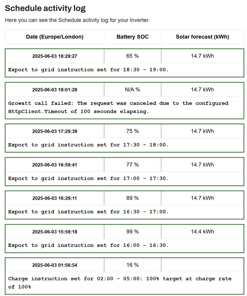There has been two occassions today that during my daily export between 16:00 to 19:00, the export failed to happen even though the schedules have been set and the battery has enough charge. I have scheduled the export to run every 30 minutes during that time.