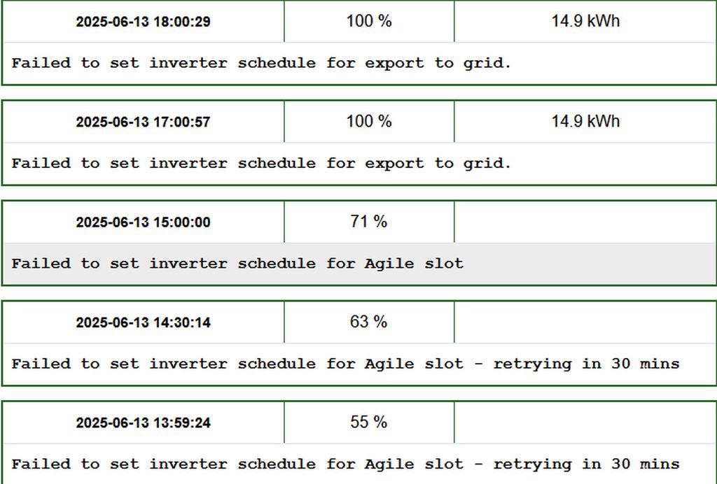 Is anyone else having issues with their Growatt inverter not accepting any commands? My last successful one was at 3:30 this morning, and I've not been able to issue anything from the web interface or the Shinephone app either: