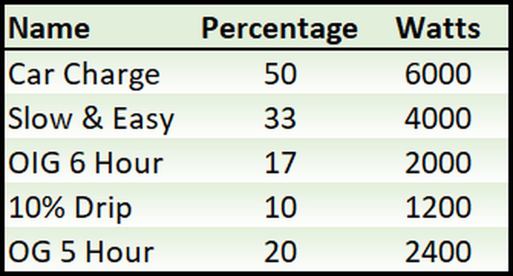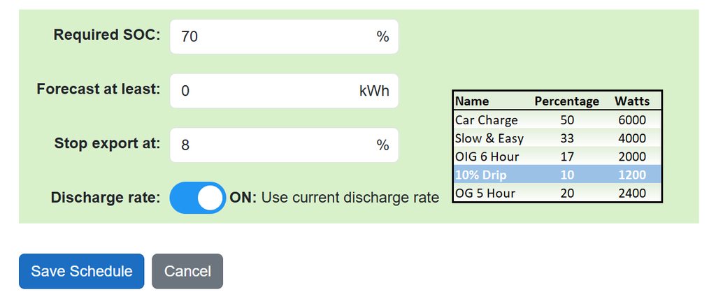 As it stands we have an Inverter rate for each system which is dual purpose both for Charge and Discharge, why not add in Advanced settings a Discharge Inverter Rate (as discussed above). These two rates are then the Maximum Global Rates for both Charge and Discharge. Then In Advanced Settings, allow users to create say 5 Charge and Discharge Rates which can be named similar to this. The Watts will be calculated as a percentage of the Individual Global Charge and Discharge Rates defined in Advanced Settings.