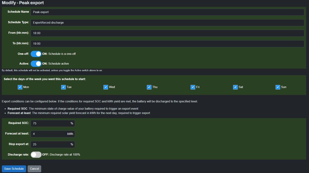Next, you want to create a peak export schedule. This is how you're going to maximise returns, something like this: